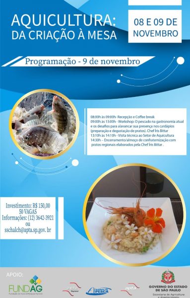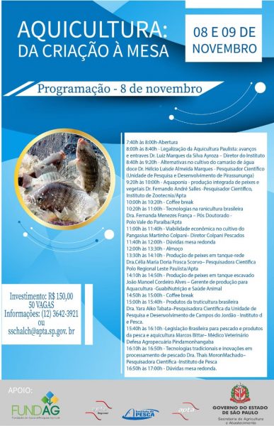 Evento – Aquicultura: Da Criação à MesaPublicada em 22 de outubro de 201808 à 09 de Novembro Investimento: R$ 150,0050 VagasInformações: (12) 3642-3921E-mail: sschalch@apta.sp.gov.br