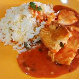 Filé de Tilápia com molho de tomate e leite de coco