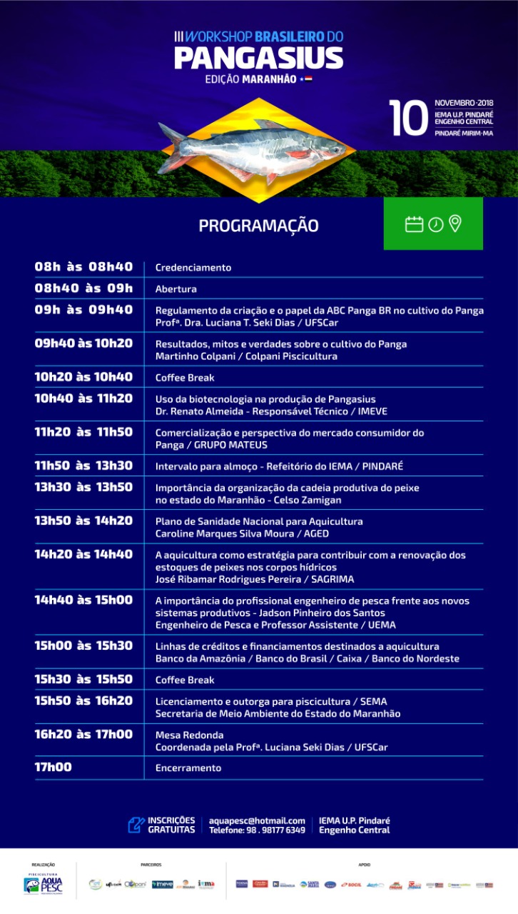 A Piscicultura AQUAPESC, realizará em parceira com a ABC PANGA, COLPANI PISCICULTURA E UFSCAR, o III WORKSHOP BRASILEIRO DO PANGASIUS – EDIÇÃO MARANHÃO, no dia 10 de novembro de 2018, das 08:00 às 17:00 horas nas instalações IEMA – Instituto educacional de ciência e tecnologia do Maranhão., U.P. Pindaré, localizado no Engenho Central da cidade de Pindaré Mirim.